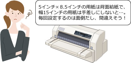 ドットプリンタで印刷する時に問題となるのが、さまざまな用紙サイズがあり、印刷する用紙を変えるごとにプリンタやソフトでの設定もしなくてはならないという面倒さです。