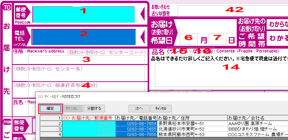 6. フォーム上のスペースに数字が表示され、「スペースとデータの対応づけ」画面が表示されます。 ここでフォームのスペースとデータの列(縦の並び)を関連付けます。 対応するスペースとデータの列をそれぞれクリックし、両方反転させた状態で【確定】をクリックします。