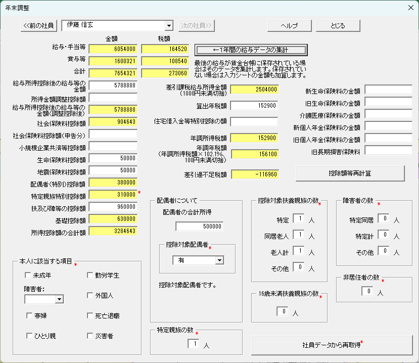 社員の扶養親族も登録できますので、毎月の給与明細はもちろん、1年分のデータを集計して年末調整し、源泉徴収票に印刷することもできます。