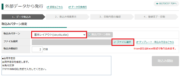 「読み込みパターン」は「基本レイアウト(csv,xls,xlsx)」を選択します。